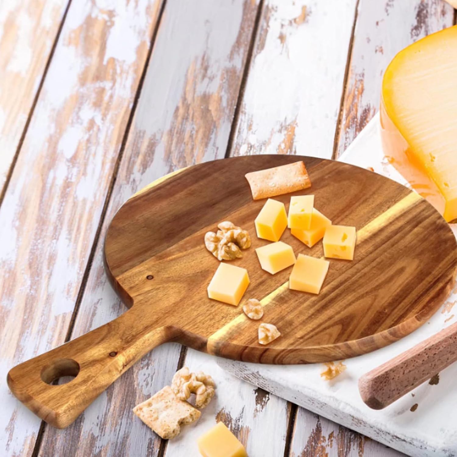 Das Brett kann sowohl als Schneidebrett als auch als Servierplatte für verschiedene Speisen verwendet werden.